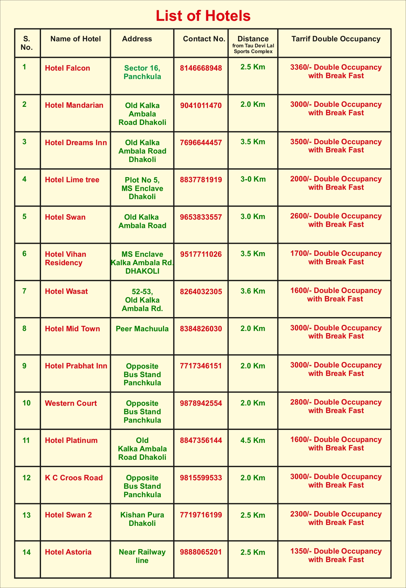 Tournament Name & Hotel list