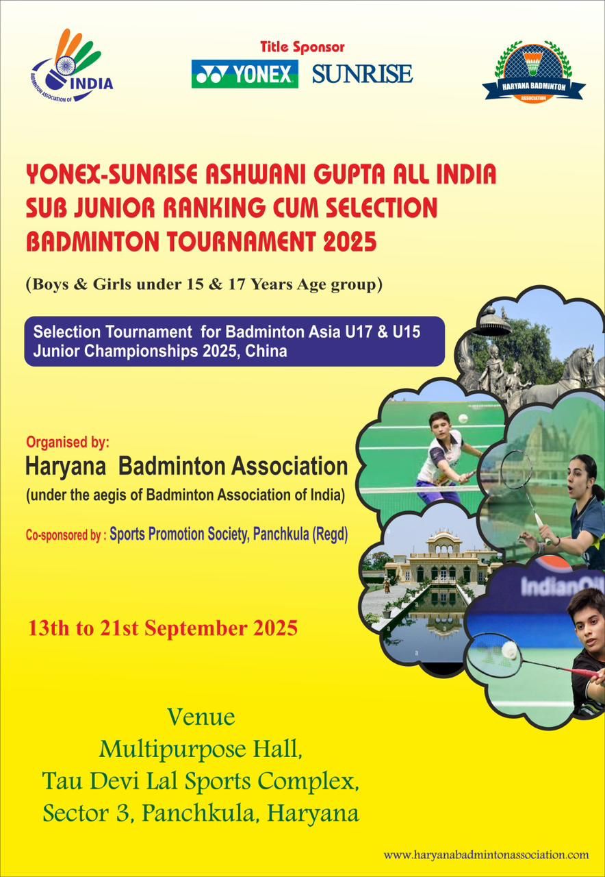 Selection Tournament —Yonex- Sunrise Ashwani Gupta Memorial All India Sub Junior (U-15 & U-17) Ranking Badminton Tournament 2025, to be held at Panchkula, Haryana from 13th to 21st September 2025 will be considered as the Selection Tournament for the Badminton Asia U17 & U15 Junior Championships 2025